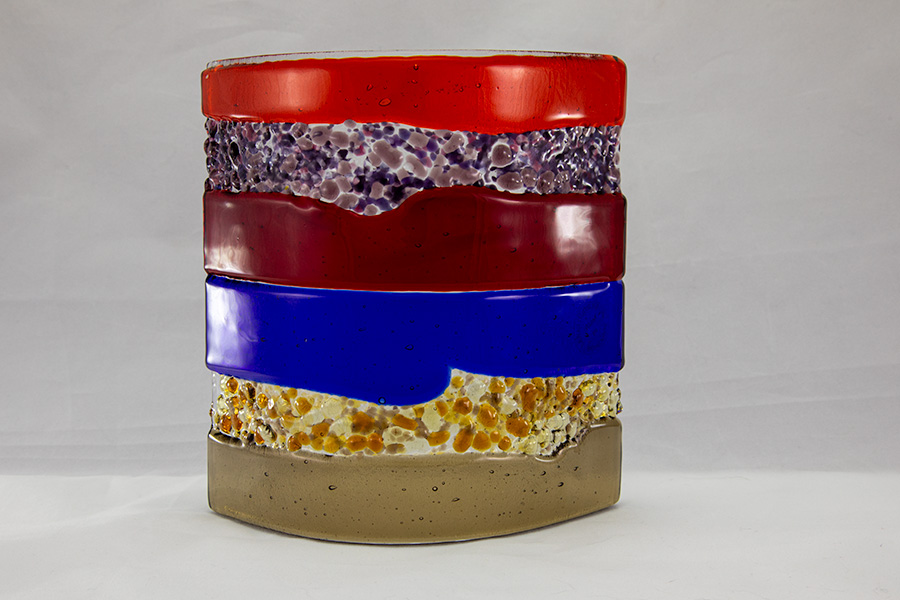 A more abstract approach to this piece, depicting the beach, sea and the sky at sunset. Constructed using the natural wavey edges of rolled glass, no two pieces are alike. The blend of transparent glass and coloured frits give depth and texture, creating a very tactile piece of glass. This medium size curve measures 13.5cm wide, 15cm high and 4.5cm deep.