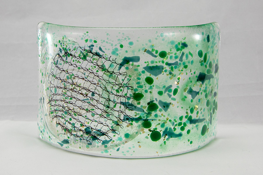 An abstract design inspired by what can lie beneath the surface of the water. An eddy, fishing nets, seaweed. This piece includes knitted copper and mica powder. This smaller curve measures 14cm wide, 9cm high and 5.5cm deep.