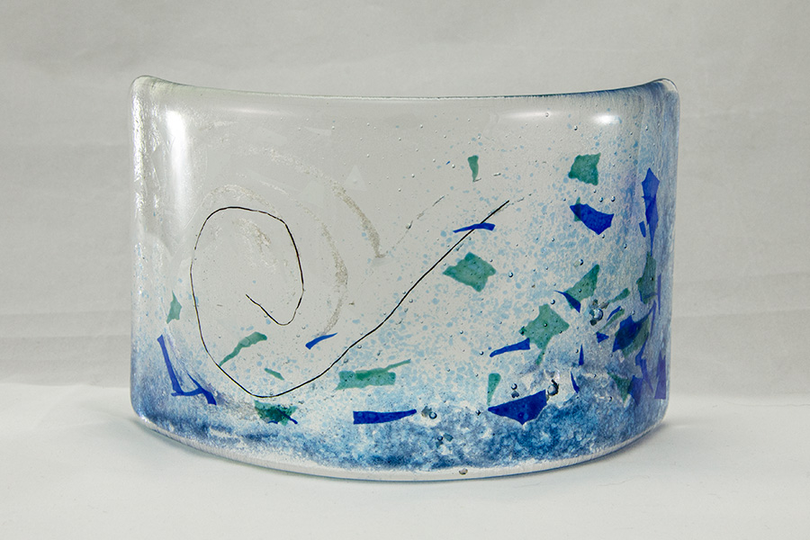An abstract design inspired by the roll of the waves and surf and the power of the sea. This piece includes copper wire , confetti glass and mica powder. This smaller curve measures 14cm wide, 9cm high and 5.5cm deep.