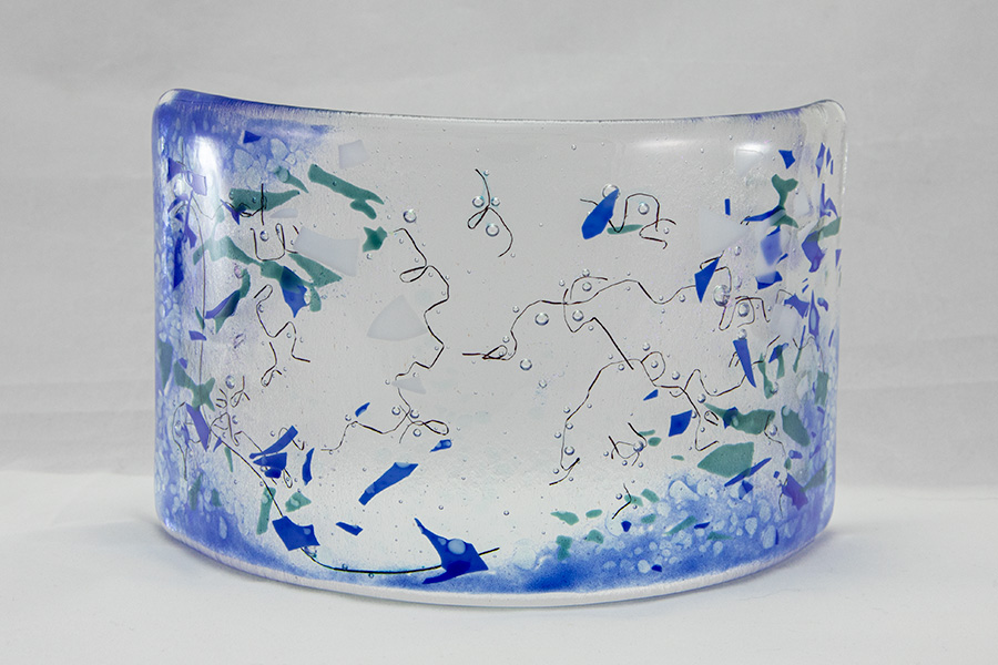 A more minimal and abstract approach to this piece. Using the natural edges of rolled glass, no two pieces are alike. The blend of transparent and opaque glasses give depth, frits are added for texture, creating a very tactile piece of glass. This medium size curve measures 14cm wide, 15cm high and 4.5cm deep.