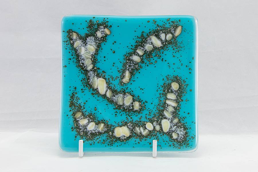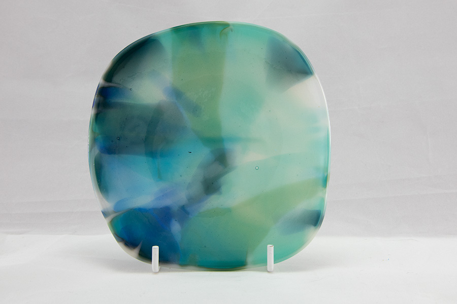 The glass used for this dish was pressed during the initial firing, creating an abstract design of soft blue green colours. The glass was then slumped into a shallow dish form. Measures 12cm by 12.5cm approx’, height 1.5cm.