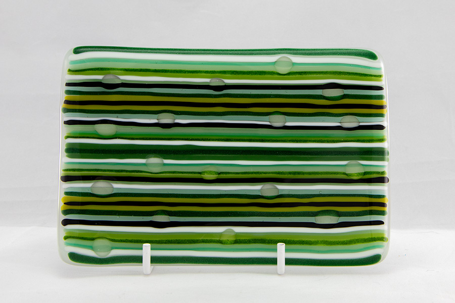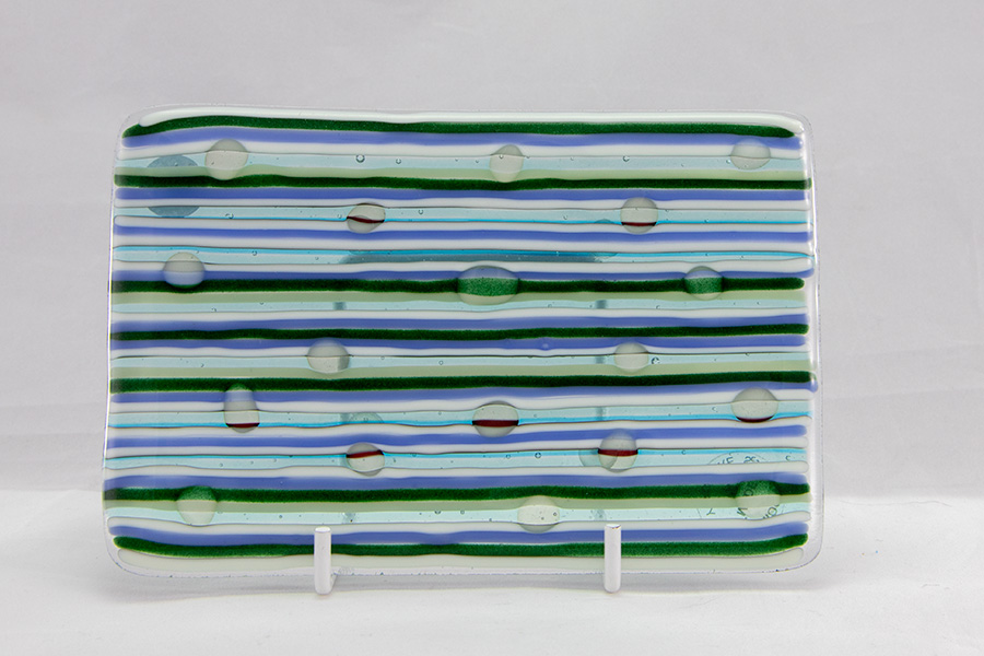 Shallow square dish with stripes of blue shades with the addition of some sparkly aventurine green. Measures 11cm by 11cm and 2cm high.
