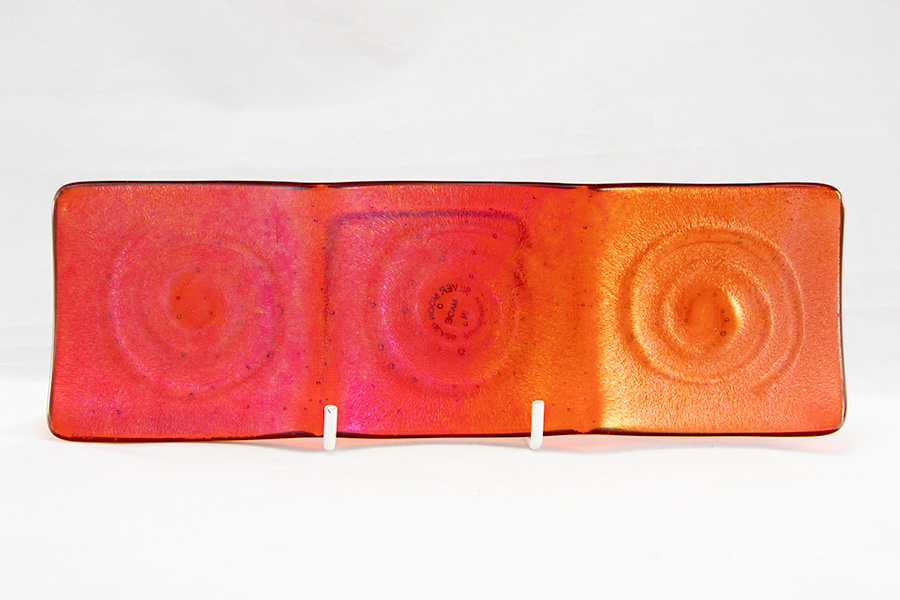 Long rectangular orange iridised glass triple dish with kiln formed spiral decoration. The glass dish has a textured finish, can be used for tealights. Measures 22cm by 7.5cm.