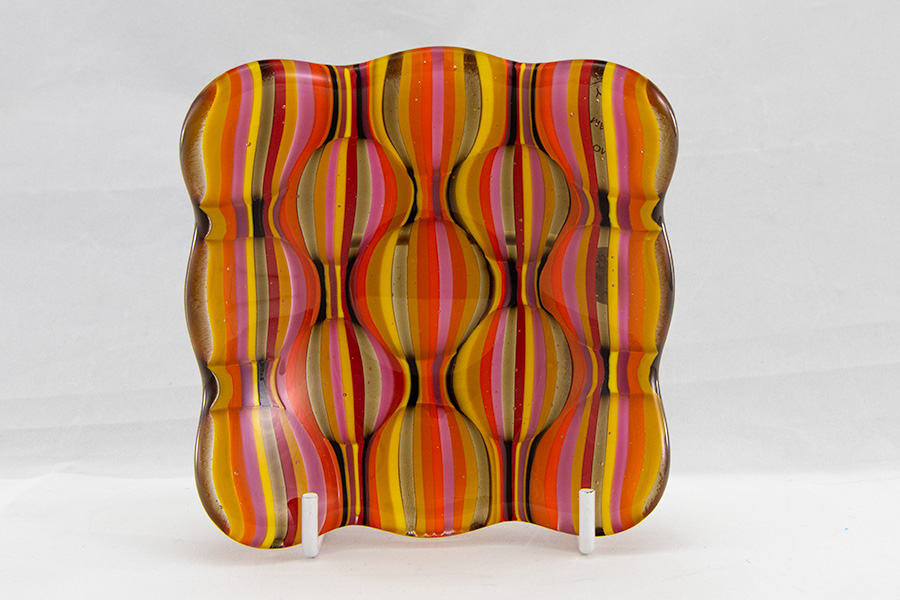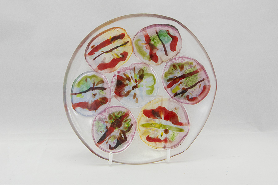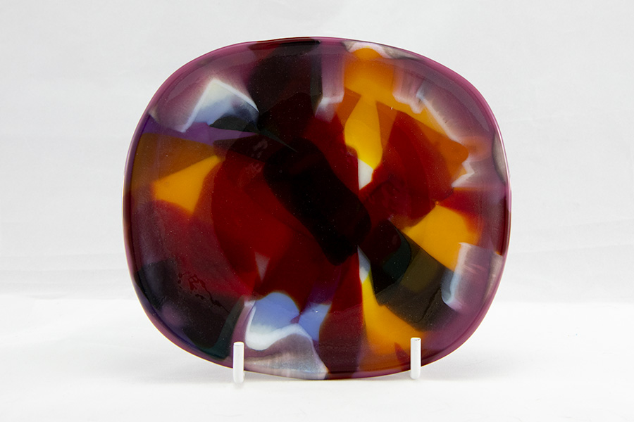 The glass used for this dish was pressed during the initial firing, creating an abstract design of rich colours. The glass was then slumped into a shallow dish form. Measures 11.5cm by 13cm approx’, height 1.5cm.