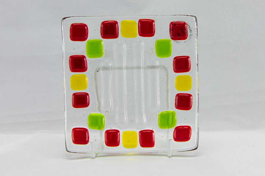 Colourful soap dish with raised red, yellow and green squares and clear bars, to help keep the soap dry. Measures 10cm by 10cm, height including no slip feet 2cm.