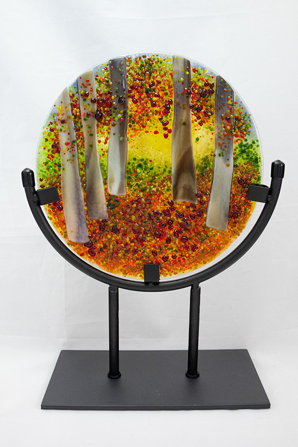 I love walking through woodland landscapes, in particular autumn. We used to own a chestnut mare and my favourite time of year was autumn, when the leaves matched her beautiful chestnut colour. As the sun stays lower in the sky, it enhances the rich autumn colours, something I enjoy depicting in my autumn woodland pieces. The glass circle is 20cm in diameter. The height, including the stand, is 30.5cm.