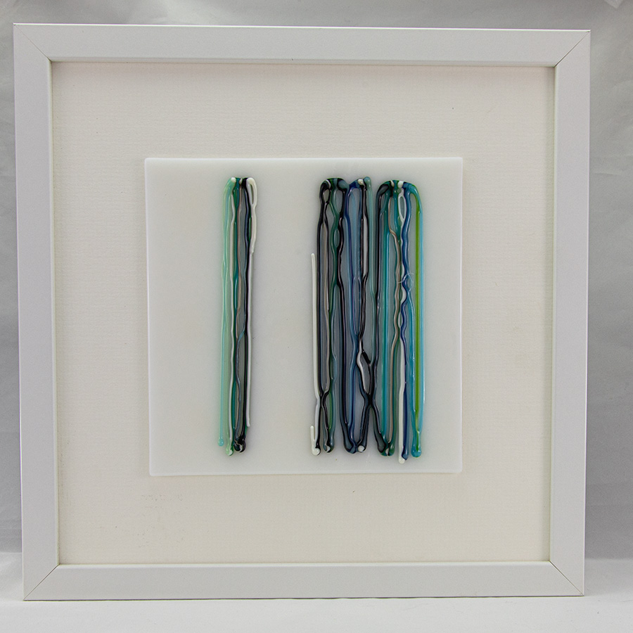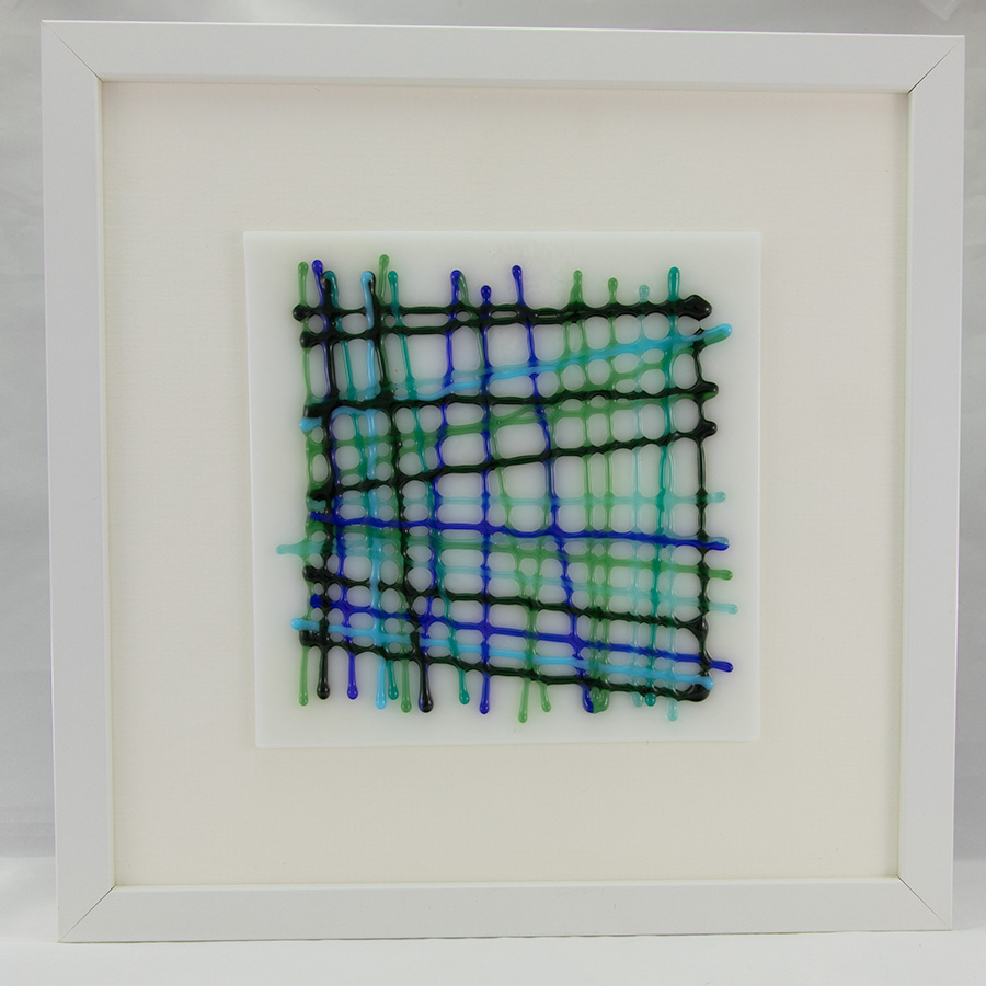 Square design which gives the effect of green and blue molten glass piped in linear pattern. The glass square measures 15cm by 15cm and the frame 27cm by 27cm by 6cm deep. This piece can be displayed freestanding or hung on a wall.