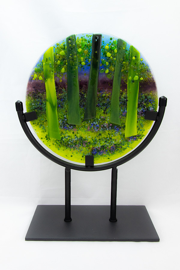 One of a number of bluebell wood pieces I have made. They have all been inspired by one of my photographs, taken at Temple Newsam Park, Leeds, when the bluebells in the woods were in full bloom. This circle is highly textured, creating a feeling of depth to the scene, reflecting the dappled sunlight, as well as the vibrant bluebells. The glass circle is 20cm in diameter, the height, including the stand, is 30.5cm.