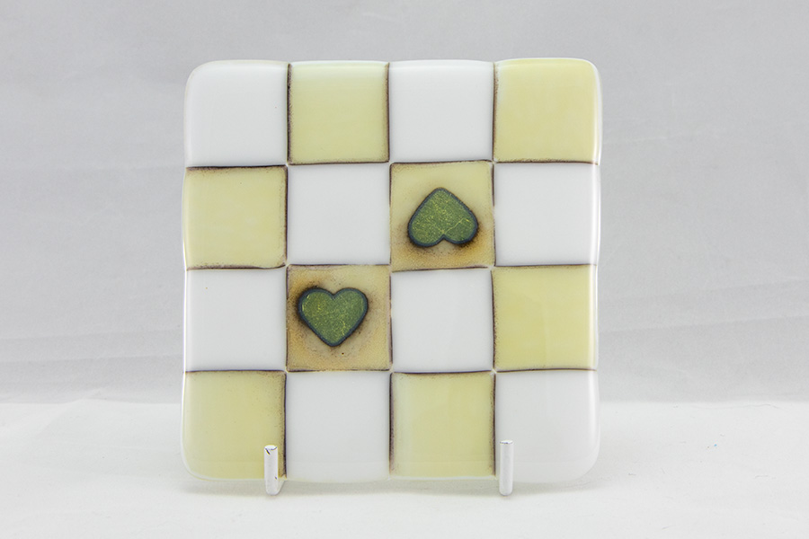 Vanilla and white glass coaster with two silver leaf hearts. Measures 10cm by 10cm approx' and has four nonslip feet to the underside.