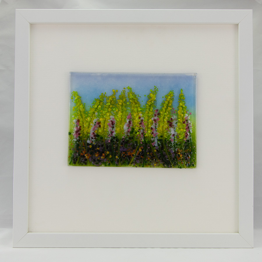 I usually make the summer flower border and meadow pieces in a curved form but I also make some and frame them, so they can be hung on a wall. A fabulous display of yellow, pink, purple and orange flowers, against a backdrop of a clear blue sky. The glass measures 14.5cm by 10.5cm and the frame 27cm by 27cm. The frame can be displayed freestanding or hung on a wall.