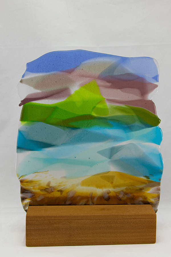 A seascape made of various colours of glass that have been pressed during the firing process, giving a lovely soft effect. Measures 22.5cm high, including the wooden stand, by 18cm wide.