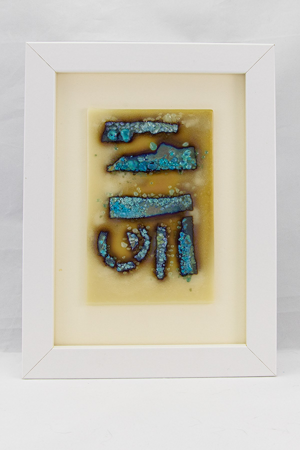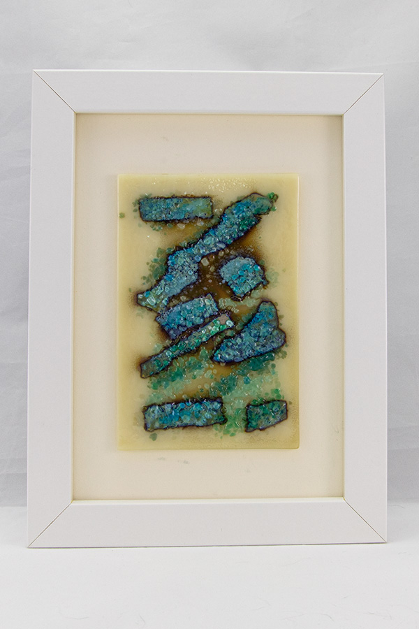 Created using a two part process, which gives the look of glass in a fluid state. The glass measures 15cm by 15cm and the frame is 27cm by 27cm and 6cm deep. This can be displayed freestanding or hung on a wall..