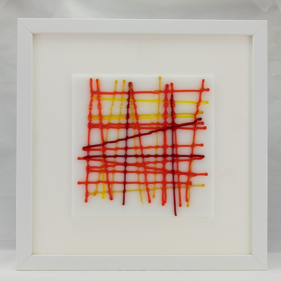 Square design which gives the effect of yellow, orange and red molten glass piped in linear pattern. The glass square measures 15cm by 15cm and the frame 27cm by 27cm by 6cm deep. This piece can be displayed freestanding or hung on a wall.