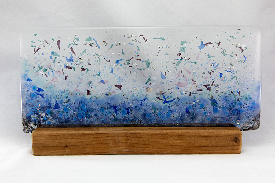 Inspired by the sea spray as large waves crash. The feeling of movement is created by the use of mica flakes, confetti glass, metallic dichroic glass and copper threads. Measures 34cm wide and 17.5cm high, including the wooden stand.