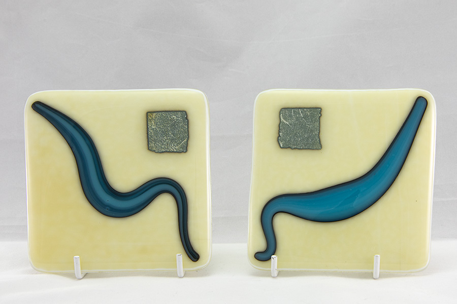 A beautiful pair of coasters using the reactive qualities of pure silver leaf with vanilla glass and turquoise glass. Each coaster measures 10.5cm by 10.5cm approx’. They each have four clear non slip feet, on the underside.