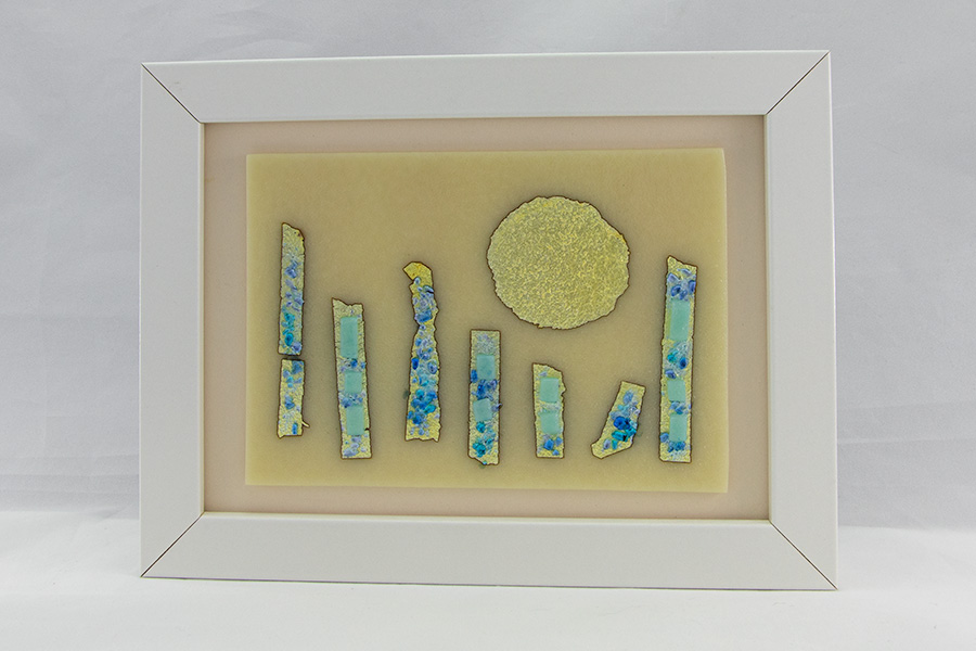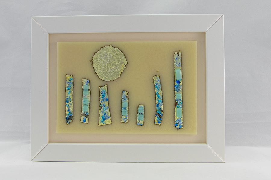 An abstract piece using the reactive qualities of pure silver leaf with vanilla glass and turquoise glass. The glass measures 12cm by 8cm and the frame 20.5cm by 15.5cm and 3.5cm deep. This can be displayed freestanding or hung on a wall.
