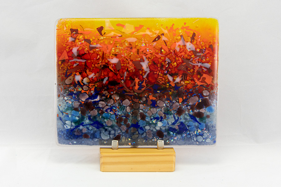 A combination of rich colours with mica flakes, confetti glass, metallic dichroic glass and copper threads makes a striking sunset over the choppy sea. The glass measures 17.5cm by 14cm, comes with the stand shown in the photograph.
