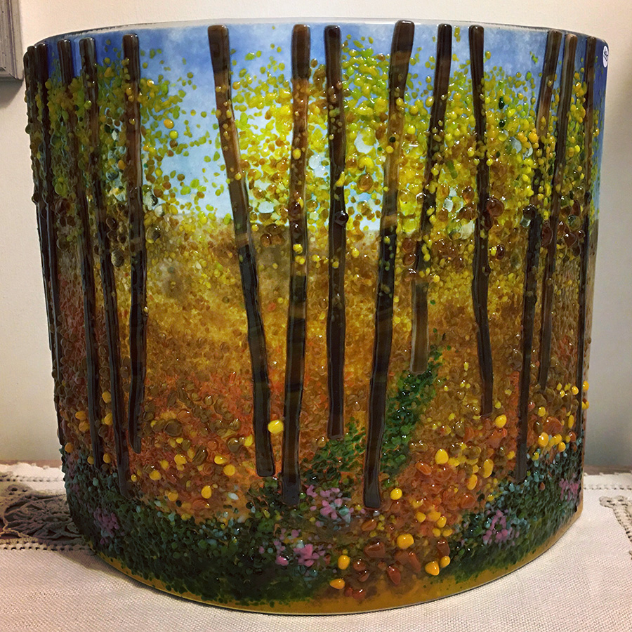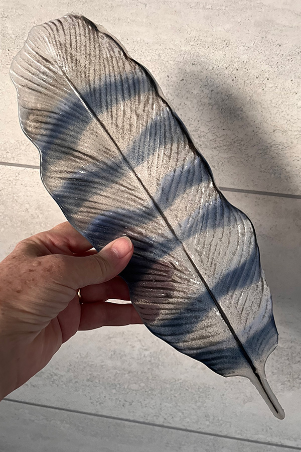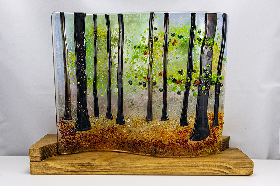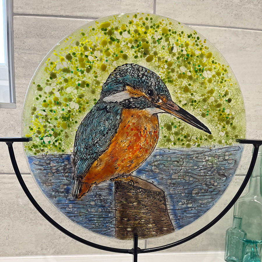 This piece uses special production glass, for the background. The details on the bird are painted with traditional stained glass paint.